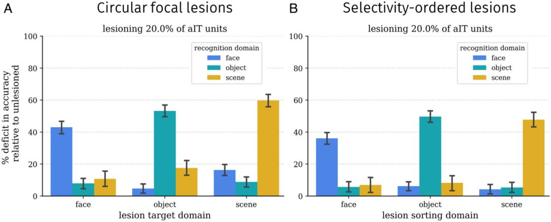 接下来,研究人员在模型中进行了一系列损伤分析,以与面部和物体识别的神经心理学数据进行比较。