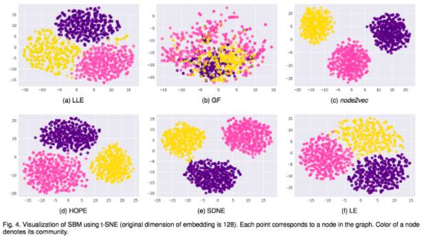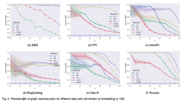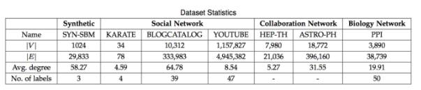 文章[2]在人工生成网络、社交网络、论文合作网络和蛋白质网络上对几种常见的向量化方法进行了网络重构、节点可视化、链路预测、节点分类的评测,大部分模型实验的输出结果是128维的向量。网络信息如下: