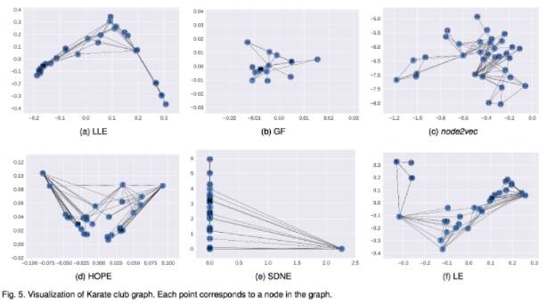 从网络结构和节点性质来看,SDNE 和 node2vec 保留了原始网络较多信息。尤其是 SDNE 把节点0单独放到了很远的位置,因为它是社区间的 bridge 节点。而 HOPE 对 0、32、33 的社区中心节点属性刻画的比较好,并且明显地划分出两个社区。GF 的表现依然比较差,除了把度大的节点放在了中心,叶子节点放在了周围,并没有很好的区别社区距离。
