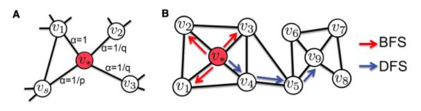 Node2vec 是对 DeepWalk 的一种更广义的抽象,它引入了 biased-random walks,用来刻画每次随机游走是偏深度探索(DFS)还是广度探索(BFS),分别侧重社区结构和节点重要性的信息。由于 node2vec 有 p 和 q 两个超参数,所以它是一个比较灵活的模型框架。后面也会讲到,它在节点分类问题中有着不俗的表现。