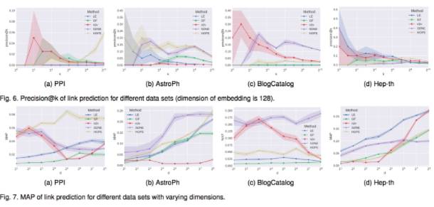 从 Top k 预测准确性来看,node2vec 模型在 BlogCatelog 数据中表现最好,其他数据集就比较一般(在 PPI 的 Top 表现也不错)。HOPE 模型在 k 比较大时,效果一般在中上位置,比较稳定。