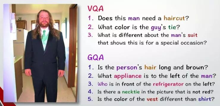 GQA 数据集的许多问题涉及多种推理技巧、空间理解以及多步推理,比起人们先前常用的视觉回答数据集,更具有挑战性。他们保证了数据集的平衡性,严格控制不同问题组的答案分布,以防止人们通过语言和世界先验知识进行有据猜测。