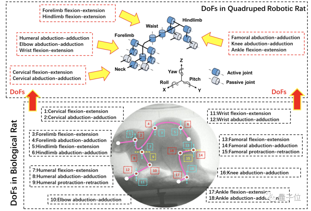 于是,研究人员为机器老鼠配置了12个活动自由度(四肢各有2个自由度,腰部2个屈伸自由度,颈部2个自由度),以及4个被动自由度,以模仿关节的屈伸和转动。