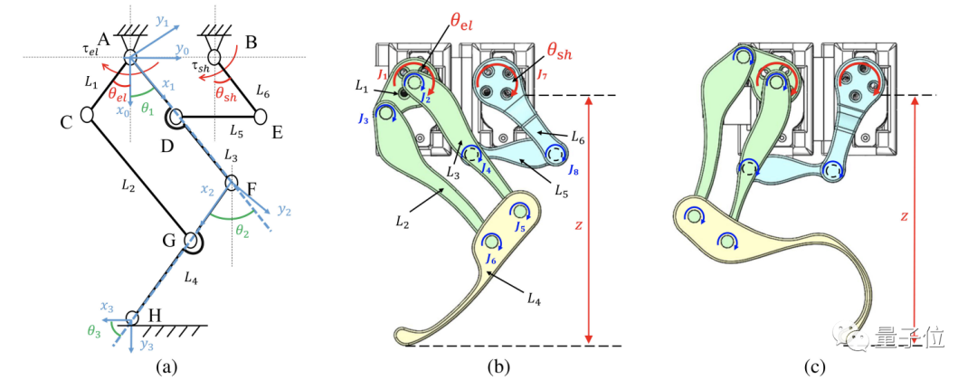 图a、b分别为左前肢的机构运动简图和骨架模型结构;c为左后肢的骨架模型侧视图。