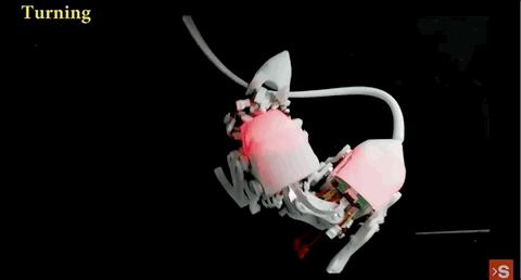 因此,研究者为脊柱配备了三个关于屈伸的主动自由度,用于机器小鼠的正面转弯运动。