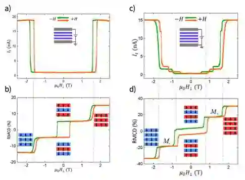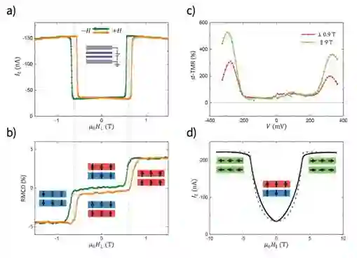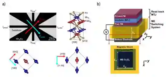 1975年,Julliere首次在Co/Ge/Fe磁性隧道结 (Magnetic TunnelJunctions, MTJs)中观察到了隧穿磁阻效应 (Tunnel magnetoresistance, TMR)2。其两层铁磁材料间基本不存在层间耦合,只需要一个很小的外磁场调控就可以实现基于电子自旋隧穿电阻的巨大变化。这类磁性器件凭借电阻率高,能耗小,性能稳定的优势,有着不容小觑的前景,逐渐引起世界各研究团队的高度重视。如下图a所示,今年1月,德国美因茨大学的研究人员在Nature Communications发表有关利用反铁磁性锰金化合物薄膜(Mn2Au)读出和写入数字信息的论文3;而下图b也显示近期Applied Physics Letters刊登的一篇论文,报道研究人员利用氧化铬(Cr2O3)制成的新型开关元件,同样利用类似的磁性隧道结构读出数字信息,有望用于计算机存储器和闪存驱动器4。
