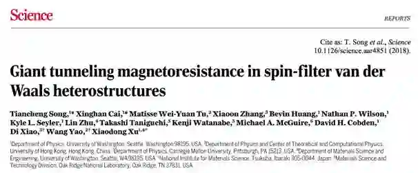 当今时代的信息爆炸性增长和后摩尔技术需求,都对增加数据储存密度,降低能耗提出了挑战。自旋电子器件应运而生,Albert Fert 和 Peter Grünberg也因发现巨磁阻效应而荣获1987年诺贝尔物理学奖。近日,华盛顿大学许晓栋教授领导的科研团队将巨隧穿磁阻效应推向二维。他们利用原子级厚度的二维磁性材料三碘化铬(CrI3)尝试编码信息,从而大幅度提升信息存储密度、降低能量耗损。该研究成果已于上周在Science线上发表,有望应用于研制新型存储器件,革新现阶段的消费电子设备和计算技术。论文共同第一作者是来自中国的宋天城博士研究生和蔡星汉博士,通讯作者是华盛顿大学许晓栋教授,香港大学姚望教授和卡内基梅隆大学的肖笛教授。1