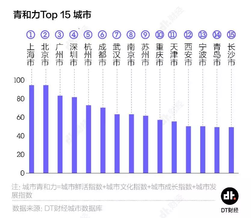 基于这样的认知,DT财经·城数发布了《2019中国主要城市青和力洞察报告》,寻找那些更适合年轻人的城市。这里用青和力来指代一座城市吸引年轻人的能力,由城市鲜活指数、城市文化指数、个人成长指数和城市发展指数共同构成。