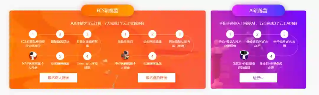 阿里云高校计划团队精心设计的ECS课程,从0开始学习云计算,7天3个项目带你快速积累云计算项目经验;AI训练营五天三个云上AI项目,手把手带你入门视觉AI。