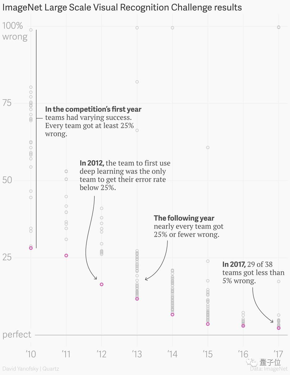 今天,她将登上CVPR的舞台,最后一次讨论ImageNet的年度结果——2017年是这场竞赛的最后一年。短短7年内,优胜者的识别率就从71.8%提升到97.3%,超过了人类,并证明了更庞大的数据可以带来更好的决策。