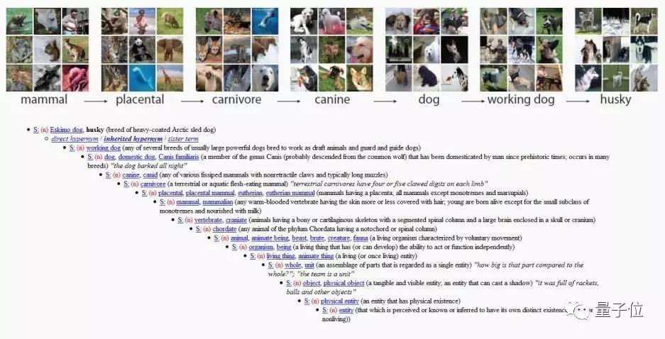 例如,在WordNet里面,dog(狗)将放在canine(犬科)下面,canine则会放在mammal(哺乳动物)下面,以此类推。这种语言组织方式依赖的是机器所能读懂的逻辑,并由此汇集了超过15.5万个索引单词。