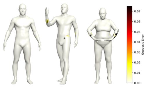 第三个实验使用FAUST数据集,包含10组不同姿势的人体外形扫描样本,每组有10个;使用前80个作为训练样本,后20个作为测试样本。