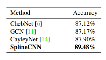 表二 不同学习方法(ChebNet,GCN,CayleyNet和SplineCNN)的Cora数据集上的图形节点分类。 显示精度是100次实验的平均精确度,其中对于每个实验,网络被训练200个epoch。