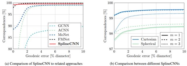 表三 (a)SplineCNN及相关方法和(b)不同SplineCNN实验的形状对应实验的测地误差图。 x轴以直径的百分比显示测地距离,y轴显示位于正确节点周围给定测地半径内的对应关系的百分比。 我们的SplineCNN实现了低测地误差的最高精度,并且明显优于MoNet,GCNN和ACNN等其他常规方法。