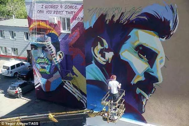 或许,梅西并不介意这些,但旁观者介意。喀山当地的艺术家迅速支起了梯子,用最快的速度在C罗旁边又画了一个梅西,同样的大小,同样的画风,不偏不倚。