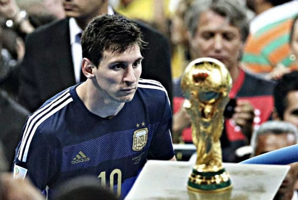 2014年世界杯决赛上,输给德国队的梅西登台领奖时路过大力神杯。 图 / 网络