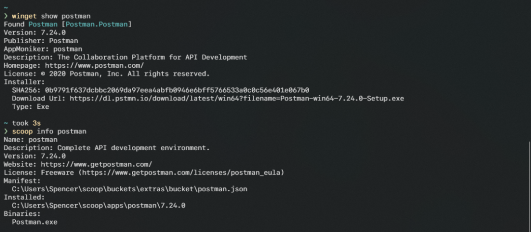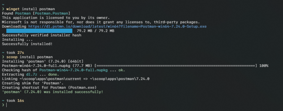 安装软件大家都一样,同样都是 winget install {软件名称} 和 scoop install {软件名称}。比如这里,我分别使用 WinGet 和 Scoop 下载安装 Postman: