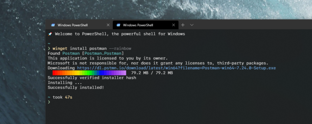 另外,WinGet 还有一个比较骚的进度条,在刚刚安装命令之后加上 --rainbow 的参数,即可解锁彩虹进度条!(🌈 净搞这些有的没的 (/▽\))