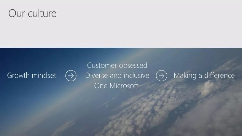 最终,我们决定将公司文化与成长型思维相结合,并着重于三个方面:客户至上,多元与包容,以及一个微软。而这些归根结底都是服务于微软公司的使命,予力每个人、每个企业成就不凡。