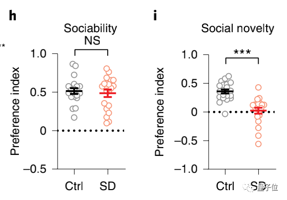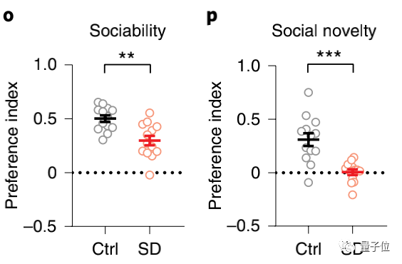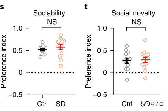 在刚成年阶段(出生后第56天)进行测试时,实验组和这个对照组小鼠的社交能力都表现正常;但是SD组小鼠在熟悉的小鼠S1面前,对陌生小鼠S2的互动明显减少,这意味着SD组小鼠的社会新事物偏好能力损失。