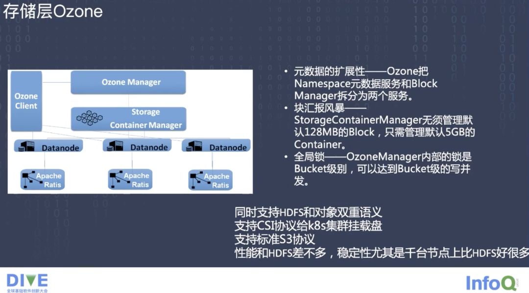 Ozone Manager 内部的锁是 Bucket 级别的,可以达到 Bucket 级别的写并发,因为 Ozone 是对象存储,对象存储的语义不存在目录和树之间的关系,因此也不需要维护全局的文件系统树,并且可以达到很高的性能吞吐。Ozone 的优势是同时支持 HDFS 和对象存储双层语义,它支持 CSI 协议让 Kubernetes 集群去挂载,也支持标准的 S3 协议。通过压测得出其整体性能和 HDFS 差不多,但稳定性要好很多,尤其是在节点数量达到千台以上规模的情况下。当然对象存储也存在天然的劣势,因为没有 HDFS Namespace 这种庞大的目录树,所以在执行 List 这种操作时会特别耗时,代价也非常高。