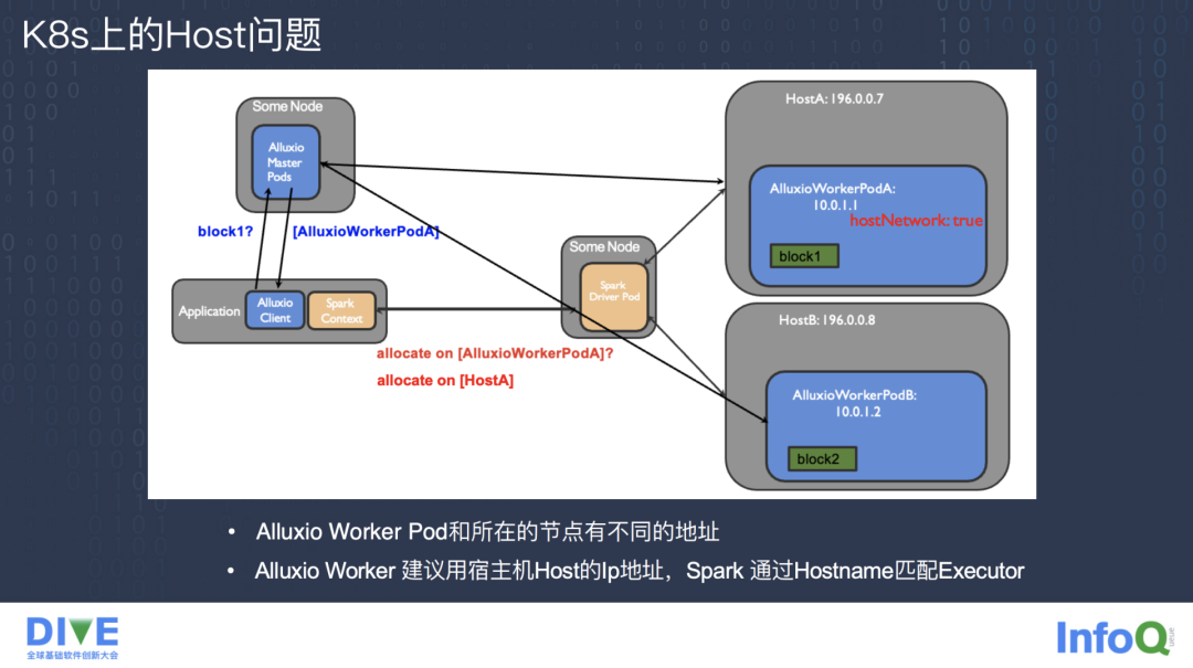 这样又引入两个新的问题,第一个是 Spark 的 Executor Pod 的 Host 和宿主机的 Host 不一样,这里同样需要让 Spark Executor 的 Pod 开启 hostNetwork 属性为 true,才可以以物理机 Host 的方式分配和 Alluxio Worker 同一物理机的节点来进行本地计算。