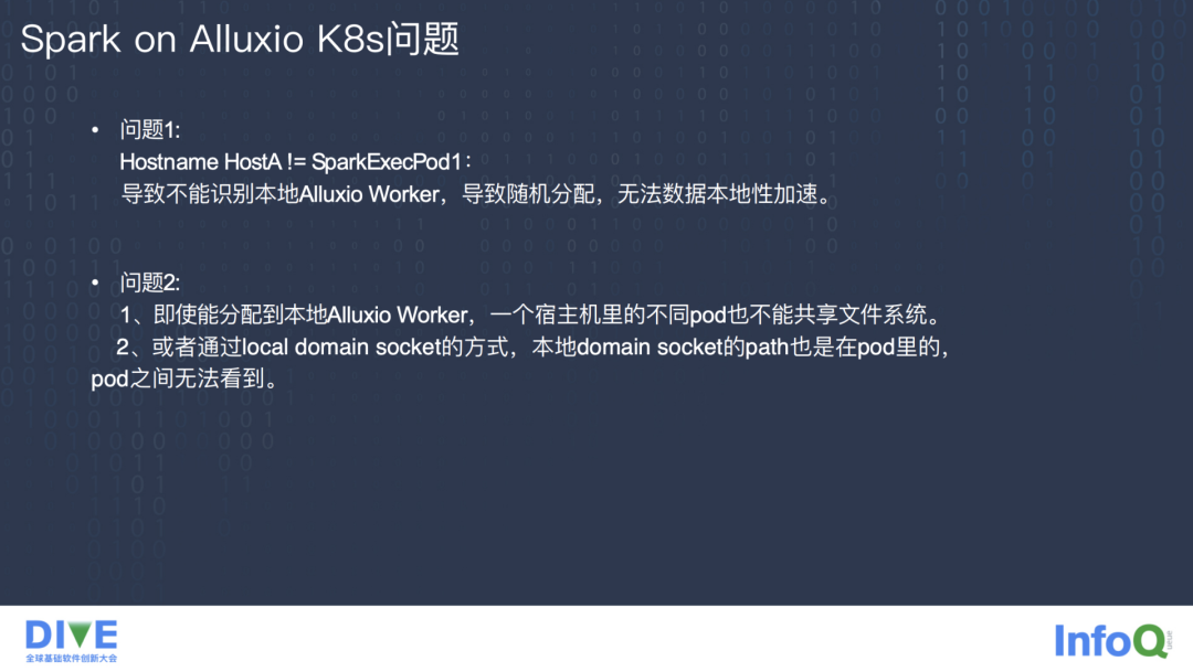 第二个问题是即使能让 Alluxio Worker 和 Spark Executor 分配到同一个宿主机上,但是因为 Alluxio 的 client 只能通过短路读或者 Local Domain Socket 的方式去访问,而 Pod 之间的文件系统又不互通。虽然可以通过 Volume Mount 的方式共享宿主机文件,但具体要访问的文件的路径和目录也是动态变化的,而且存储的文件相对比较大,所以 Volume Mount 的访问方式是很不稳定的。
