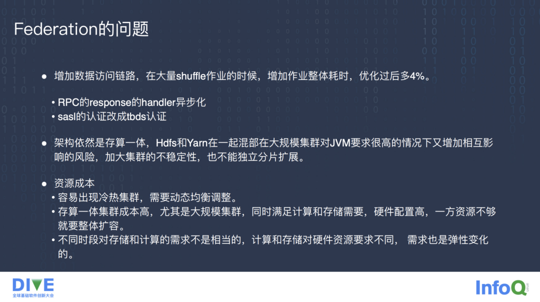 联邦架构只是多了一层 Router 代理,它没有根本性的改变原来存算一体的架构,本来联邦中每一个集群的规模和节点数已经基本达到了红线,对 JVM 的要求也达到了很高的标准,HDFS 集群和 Yarn 的混布,也加大了计算节点和存储节点相互影响的风险。而且我们在客户的生产环境上也确实遇到了相关问题,如 DataNode 为了提高处理能力,抢占系统线程数过多导致 NodeManager 分配不到线程处理任务,进而出现 NodeManager OOM 的情况,这整体加大了系统的不稳定性,所以说联邦还是在逻辑上实现了扩展,并没有打破物理上独立分片扩展的瓶颈。