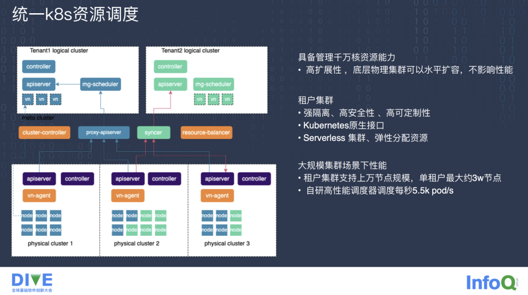 中间是自研调度引擎的 Meta Cluster 层,Meta 层主要对租户集群做了一些管控,比如通过 cluster-controller 模块可以创建新的租户集群,通过 syncer 模块进行信息同步,它将租户集群的虚拟 Pod 信息及 Pod 依赖的 ConfigMap、Secret、PV/PVC、Volume 等资源对象同步到物理集群。