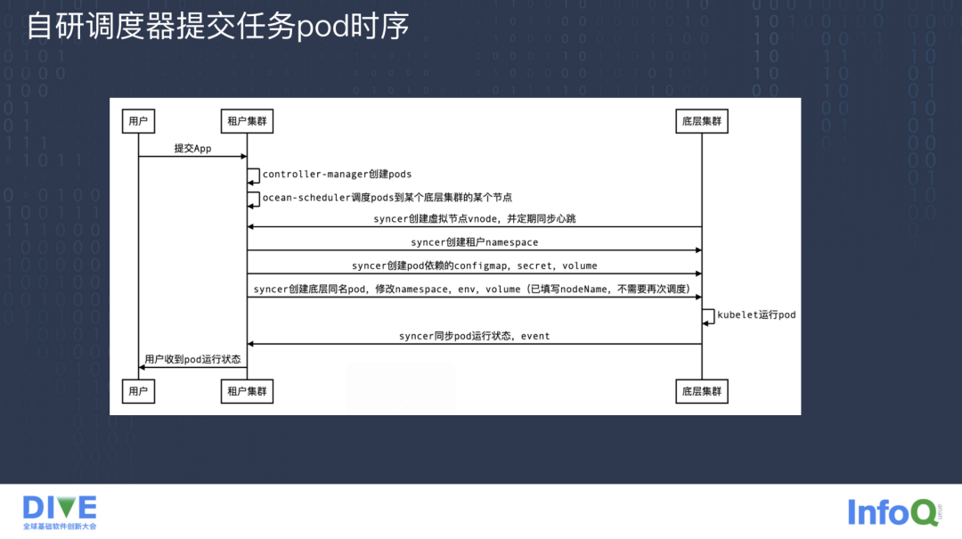 底层物理 Kubernetes 集群的 kubelet 就会运行这个 Pod,最终 syncer 感知到物理集群的 Pod 状态发生变化,就会把 Pod 的状态和 Event 事件同步到租户集群上,租户集群上的 client 用户就能收到这个 Pod 的状态,这就是通过自研调度器提交 Pod 运行任务的流程。