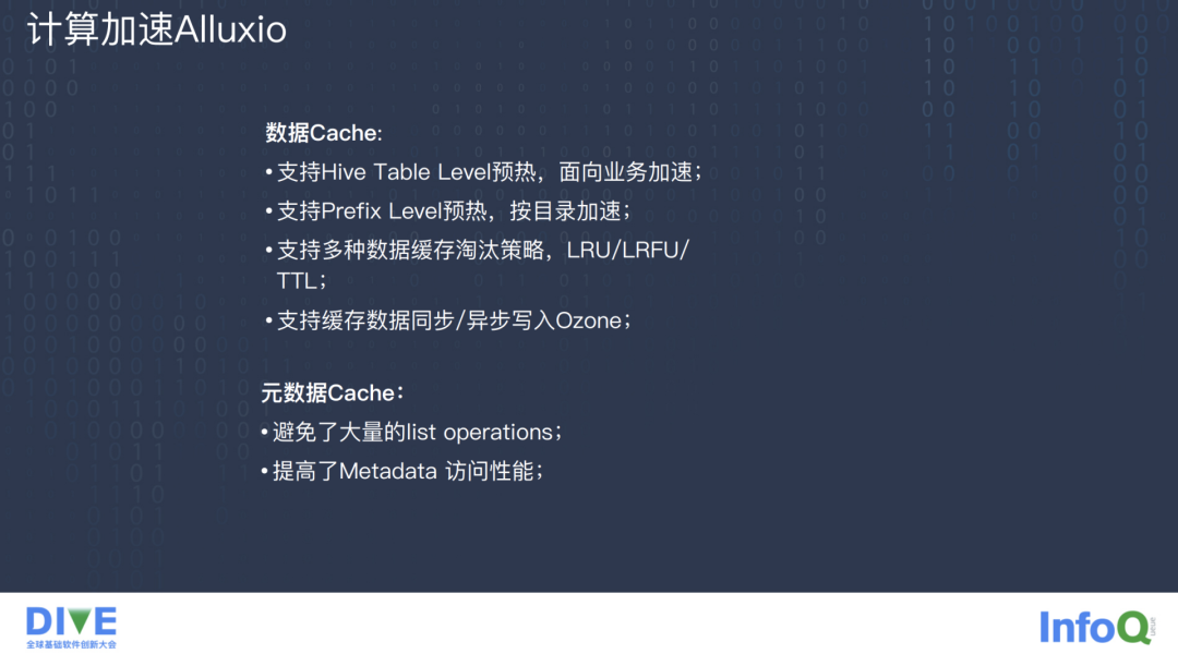 接下来就是计算加速层的优化,我们引入了 Alluxio 做计算加速。这里主要讲解一些使用场景上的优化,Alluxio 提供主动和被动两种方式获取数据,主动方式即预热的方式,比如在离线数仓场景,用户可能有很多周期性任务,比如金融系统需要每天统计账单数据,电网系统可能每天要统计电量用量的分布,这些任务周而复始,需要按天甚至按小时进行计算,我们可以在跑任务之前,主动把 Hive 表中的数据加载到 Alluxio 的 Cache 里进行计算加速。