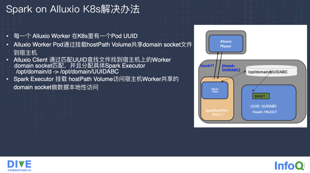 实践后得出的解决方法是让 Alluxio Worker 通过挂载 hostPath Volume 的方式共享 Domain Socket 到宿主机,比如挂载到 /opt/domain 这个路径,由于每个 Alluxio Worker 在 Kubernetes 里都有唯一的 Pod UUID,我们把 Pod 的 UUID 挂载到 /opt/domain 路径下,具体的文件就变成了 /opt/domain/UUIDA,Alluxio client 会到 Alluxio Master 询问文件的 Block 所在的 Alluxio Worker 的 Pod。