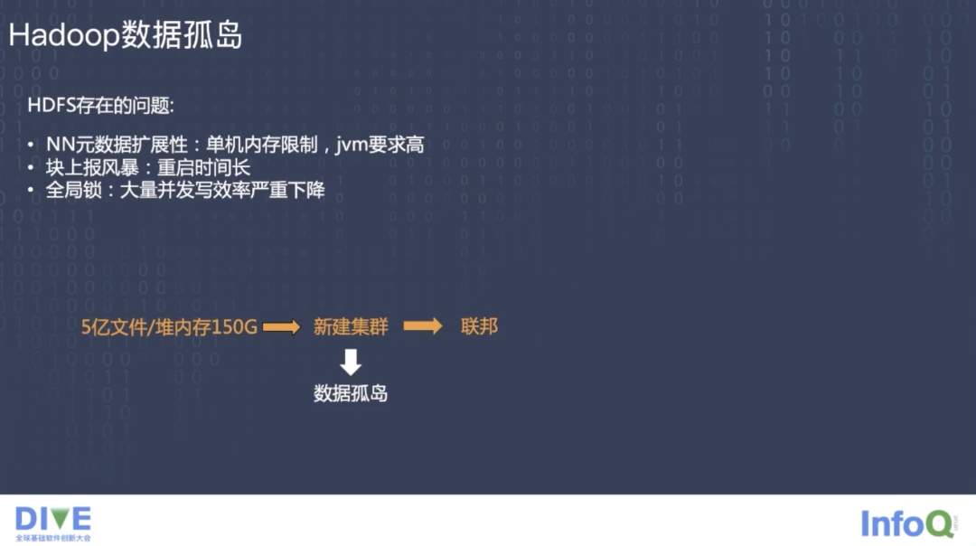 TBDS 从私有化客户处获取的经验值是 NameNode 一旦超出了 150 G 内存,或者集群整体的文件规模数量达到 5 亿时就开始新建集群,但是新集群和旧集群的数据是不通的,集群之间就会形成数据孤岛。