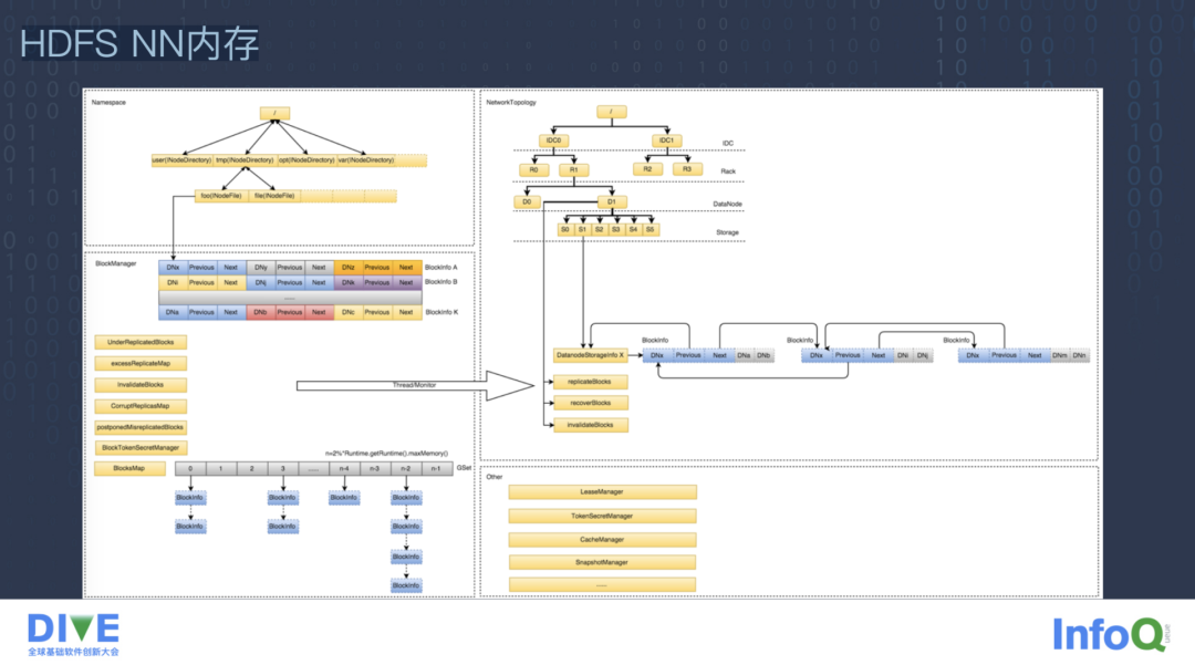 先来看一下 HDFS NameNode 的内存结构,其主要分为四个部分,左边是 Namespace 和 BlockManager,右边是网络拓扑和一些其他结构。