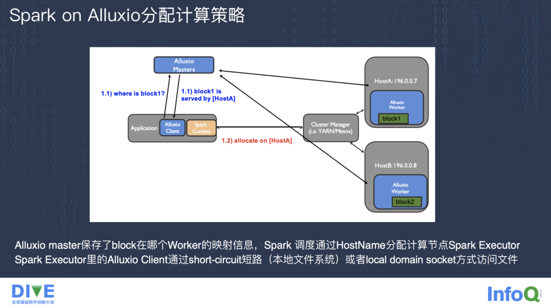 首先 Spark client 里的 Alluxio client 会到 Alluxio 的 Master 节点查找本次计算要访问的文件的 Block 具体在那个 Alluxio Worker 节点,拿到 Alluxio Worker 节点主机的 Host 地址之后,Spark client 会带着这个 Host 地址去 Yarn 或 Mesos 上要求在这个 Host 的宿主机节点上分配 Spark Executor 节点,并且启动 Task 任务。