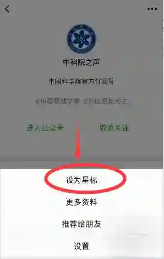温馨提示:近期,微信公众号信息流改版。每个用户可以设置 常读订阅号,这些订阅号将以大卡片的形式展示。因此,如果不想错过“中科院之声”的文章,你一定要进行以下操作:进入“中科院之声”公众号 → 点击右上角的 ··· 菜单 → 选择「设为星标」