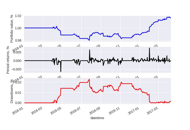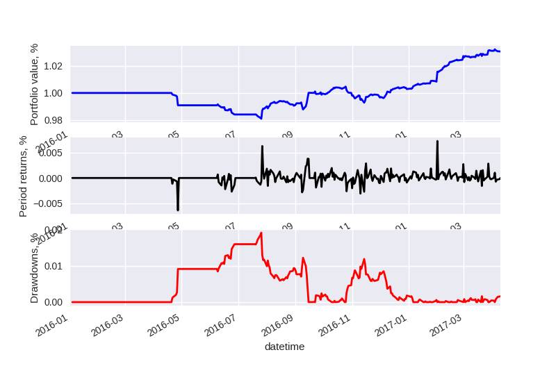 我使用这篇文章(https://medium.com/machine-learning-world/neural-networks-for-algorithmic-trading-1-2-correct-time-series-forecasting-backtesting-9776bfd9e589)介绍的回溯测试方法进行操作,下面是一些关键度量和图: