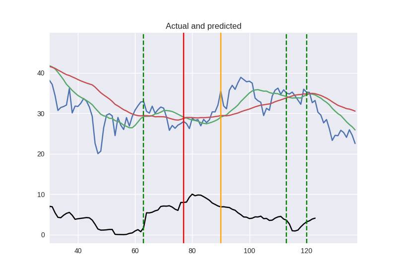 训练完成后,我绘制了收盘价、移动平均线和交叉点处的垂直线:红线和橙线是我们想要进行交易的点,绿线是我们不想进行交易的点。看起来并不完美,我们用回溯测试的方法来判断。