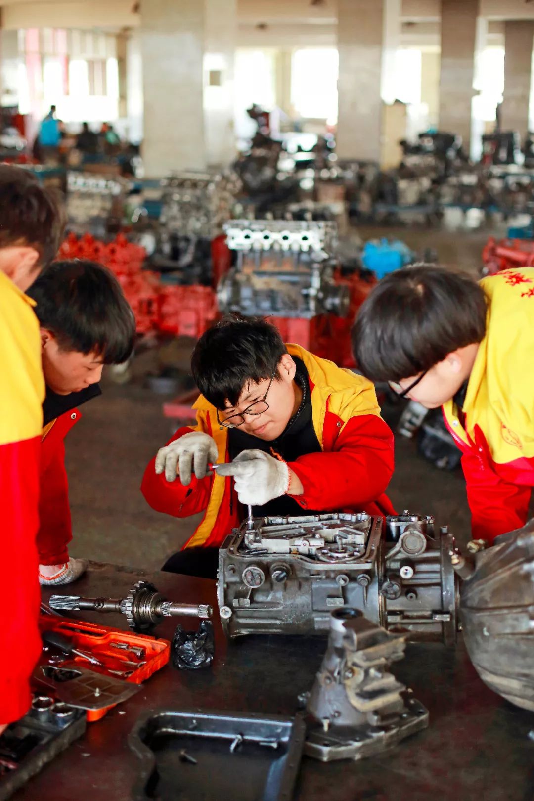 在汽修实训中心,学生正在动手拆卸汽车配件。“把工厂搬进学校”是蓝翔的教学特色之一