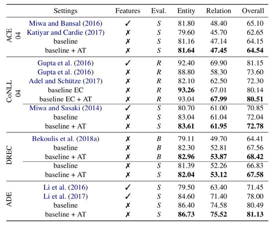 本文执行一个大规模的实验研究在这个联合模型任务上,使用了不同的语境和语言的数据集。建立了一个强大的基线,它的性能优于所有以前的模型;而且模型依赖于自动提取的特性,实现了最先进的性能。另外与基线模型相比,在训练过程中应用AT可以让联合抽取的效果持续增加。