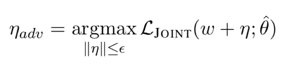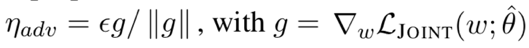其中ε为定义的超参数,和输入层的 word embedding 的维度相关。如 word embedding 为100时,ε 可以近似取值为 0.01。g 为联合损失函数在 w 方向的梯度,也正是为了说明添加的扰动对于神经网络来说是最坏的情况。