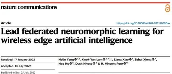 Helin Yang, Kwok-Yan Lam*, Liang Xiao, Zehui Xiong, Hao Hu, Dusit Niyato and H. Vincent Poor, Lead federated neuromorphic learning for wireless edge artificial intelligence.Nature Communication13,4269 (2022).