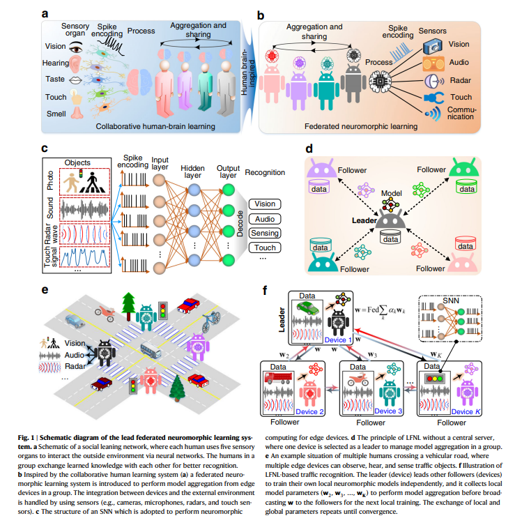 图1a显示了人类社交网络的示意图。每个人通过五个感觉器官观察外部环境的模拟刺激,然后使用神经元将刺激转化为尖峰信号,最后由人脑处理。每个人建立一个相应的知识模型,然后与其他人共享该模型,以创建一个优化的知识模型,以便更好地感知外界环境。受此启发,边缘人工智能引入了联邦神经形态学习系统(图1b),其中边缘设备配备了摄像机(视觉)、麦克风(听觉)、雷达(物体感应)、压力传感器(触摸)和射频信号检测器(无线通信)。这些传感器采用SNN作为神经形态处理器,将检测到的信息转换为尖峰信号。