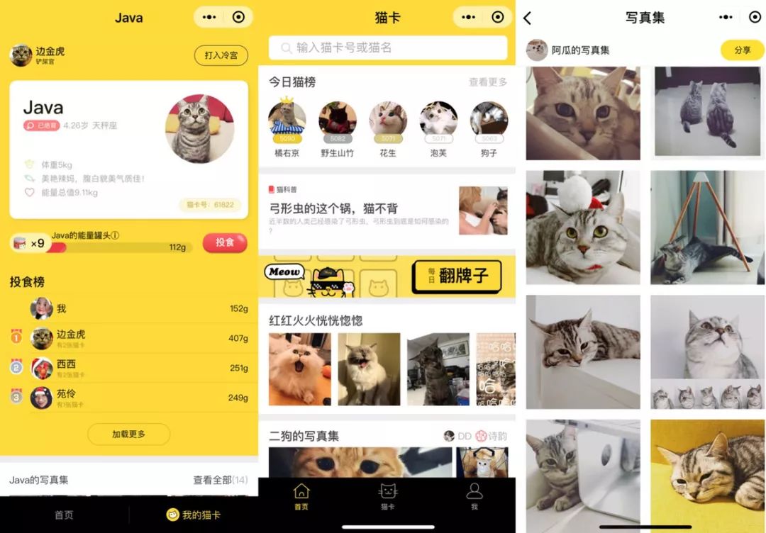 使用猫卡小程序,主人可以上传猫的美照,为猫创建带着编码的身份证,分享晒猫;云养猫的围观群众则可以投喂虚拟猫罐头,收藏别家的猫进后宫;也有今日猫榜、猫科普、每日翻盘子等轻社区版块。