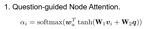 简单来说,首先通过注意力机制评估与该问题相对应的每个节点的相关性,得到每个节点i的attention weight αi。其中w是可学习的参数,vi是节点表示,q是经过LSTM的问题编码。