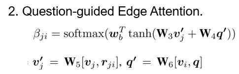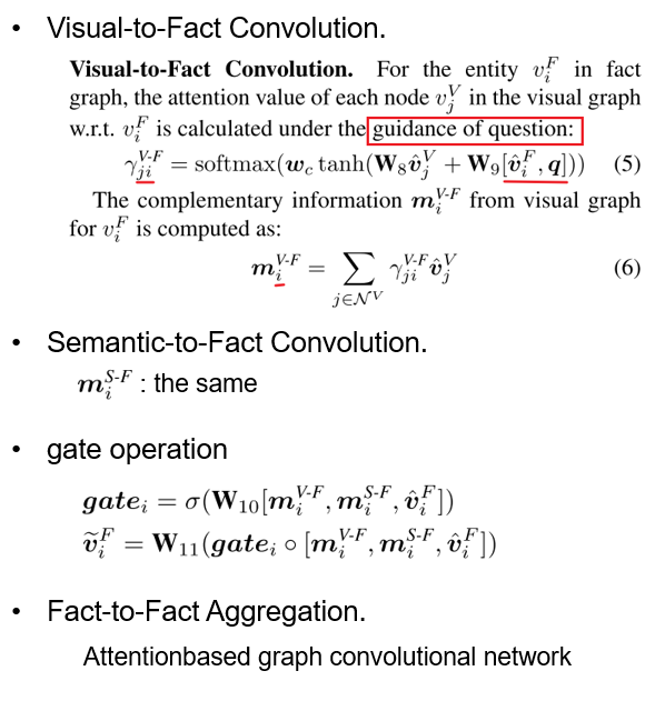 比如视觉到事实的卷积场景中,对于事实图中的每个节点vi,计算视觉图中每个节点vj和它在问题引导下的相似度注意力分数,越互补的节点它的相似度分数就越高,然后根据这个分数对视觉图加权求和,得到事实图中每个节点来自视觉图层的事实互补信息。