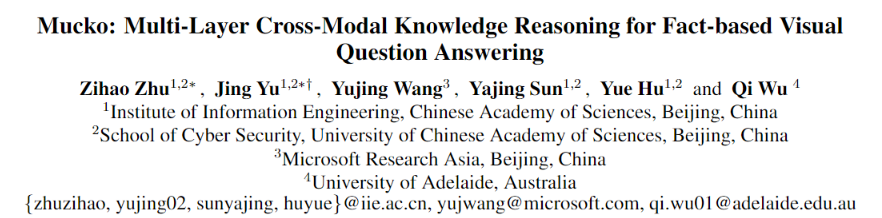 [1] Zhu Z, Yu J, Wang Y, et al. Mucko: Multi-Layer Cross-Modal Knowledge Reasoning for Fact-based VisualQuestion Answering[J]. arXiv.