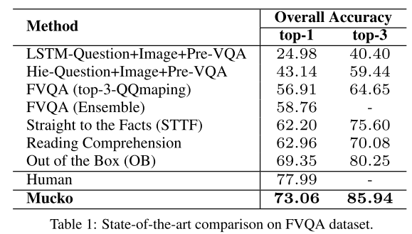 而另外一个数据集Visual7W KB也和FVQA类似,问题是直接根据Conceptnet生成的。不同点在于他不提供fact。可以看到结果也明显好于Sota。
