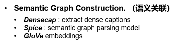 语义图包含了用于衔接视觉和知识的高层语义信息,构造原理是先使用Densecap预训练模型生成图像的细粒度caption(这既包括单个object的属性,也包括不同object的关系),然后使用Spice算法根据排名靠前的caption构造一个语义联系图。节点代表object的名字或属性,边代表关系。最后用GloVe embeddings来表示节点和关系。