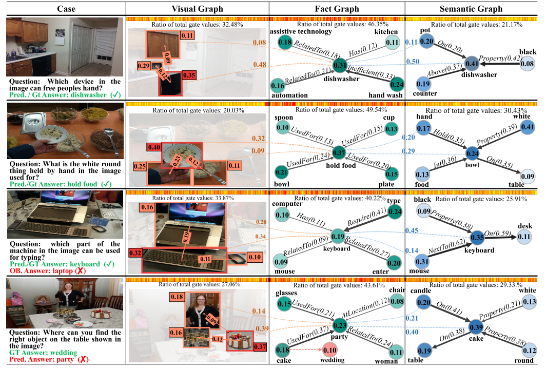 热力条根据最后特征融合时的gate值得到,密度越大则代表对应位置通道的重要性越高。可以发现,在大多数的情况下事实信息会更重要,也就是密度最大。因为FVQA中97.3%的问题都是需要额外知识才能回答的。而密度第二大的区域往往会由问题的类型决定是视觉更重要还是问题更重要。比如第二个图中问题里面的hold by这个词无法在图片中具体体现,所以所以语义信息的占比会更大一些。而第一个图的话则视觉信息占比更大。